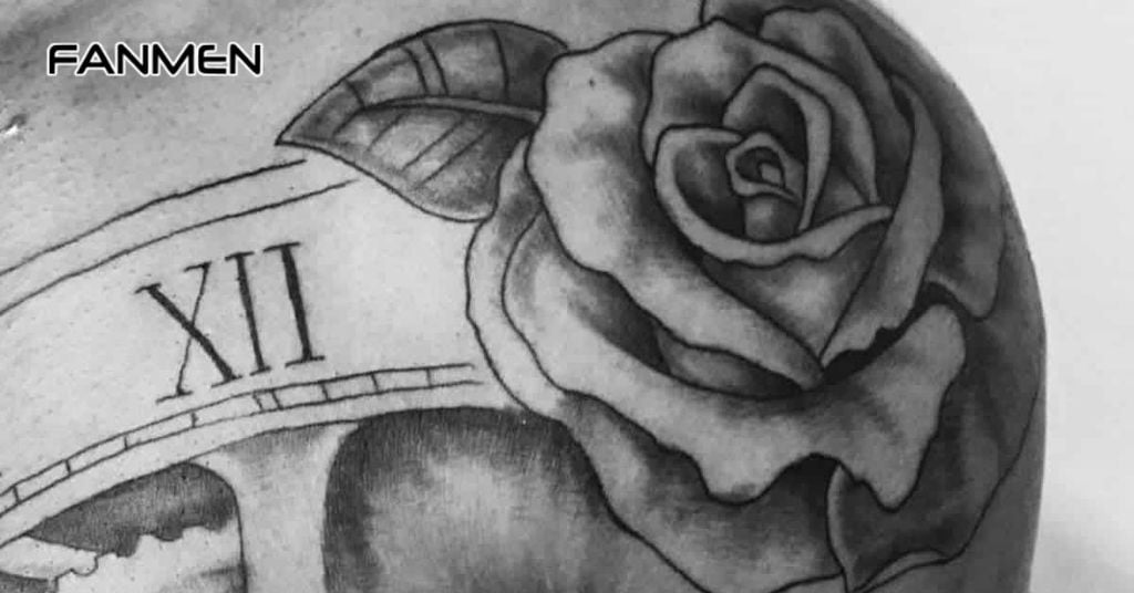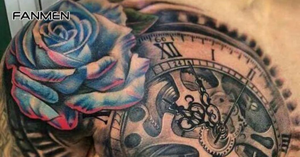 Nhiều anh em chọn thêm các chi tiết như dao găm, đồng hồ cát hay chữ nghệ thuật để tăng chiều sâu và cá tính cho hình xăm hoa hồng ở vai.