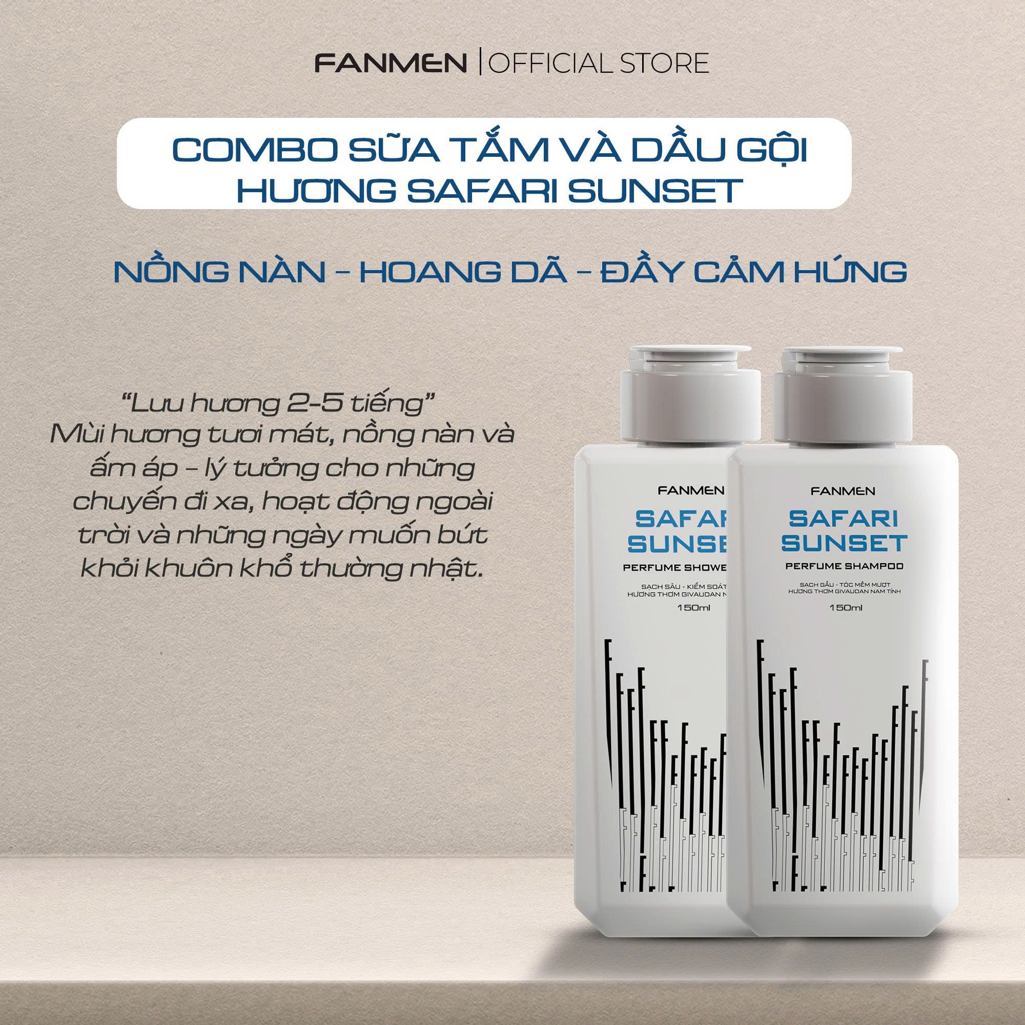 COMBO SỮA NAM TẮM SAFARI SUNSET & DẦU GỘI NAM SAFARI SUNSETCombo này sở hữu một mùi hương bùng nổ, tươi mát, tự do và sống động như hoàng hôn trên thảo nguyên. Phù hợp cho người đàn ông yêu thích sự khám phá và sẵn sàng bứt phá bản thân ra khỏi mọi giới hạn. Sản phẩm sữa tắm chứa các thành phần Glycerin & Citric Acid, Niacinamide (Vitamin B3) và phức hợp 4 axit amin có công dụng loại bỏ dầu nhờn, dưỡng ẩm, tăng sức sống làn da. Kết hợp cùng cùng với các thành phần thiên nhiên chiết xuất Trà Xanh, Lá Hương Thảo, Rau Má, Cam Thảo,… có trong dầu gội, đem lại công dụng làm sạch, dưỡng tóc chắc khỏe, giảm xơ rối và hỗ trợ phục hồi da đầu nhạy cảm.