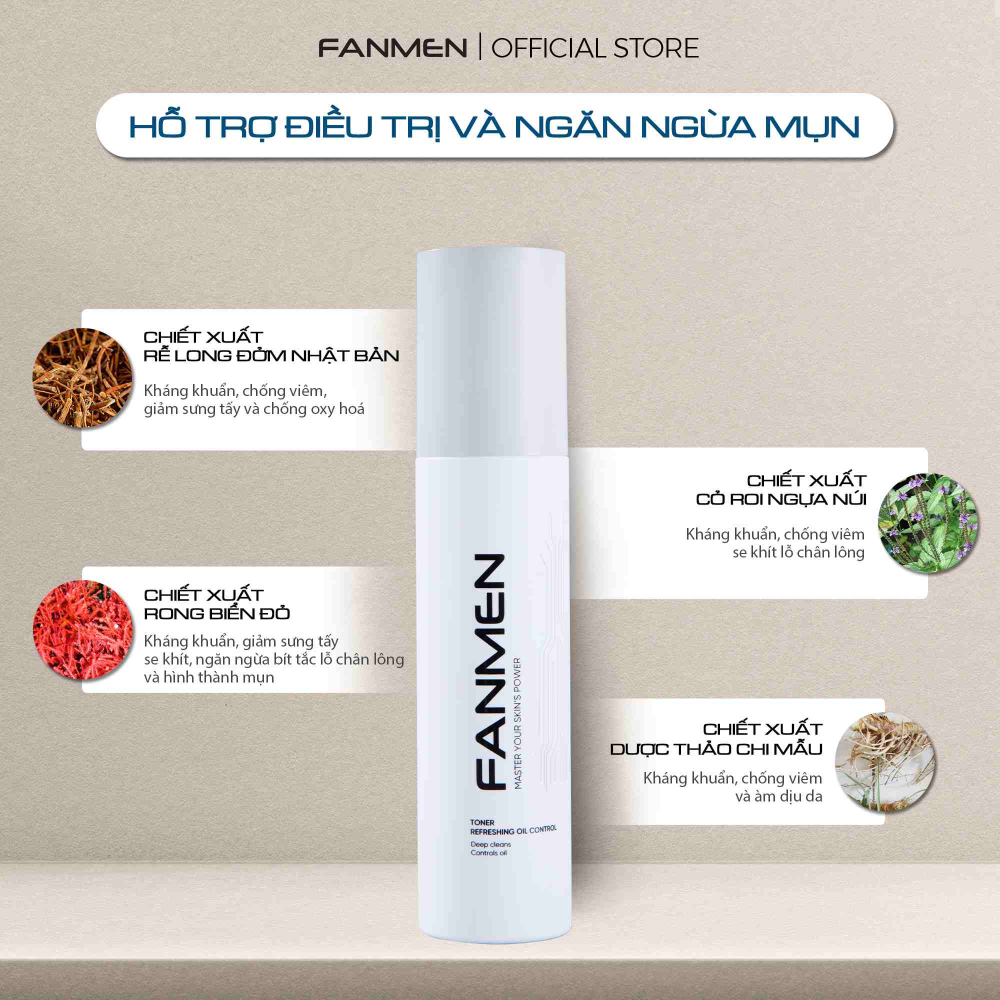Làn da mụn nam giới dễ bị kích ứng và tổn thương. Vì vậy toner Fanmen được sản xuất với các thành phần chiết xuất thiên nhiên có khả năng hỗ trợ điều trị mụn an toàn như.