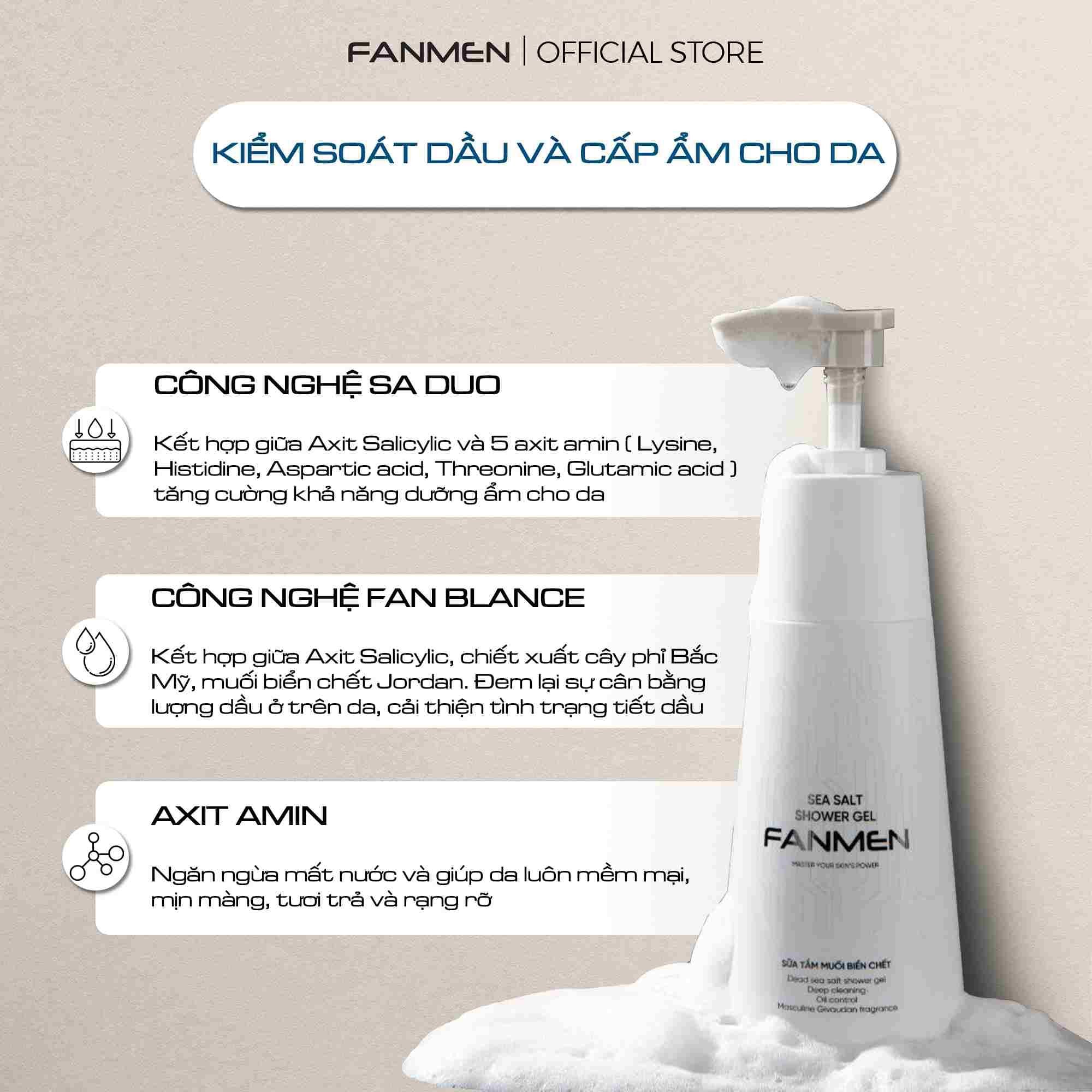 Thấu hiểu những vấn đề của nam giới, chúng tôi nghiên cứu và phát triển dòng sữa tắm muối biển chết Fanmen với khả năng làm sạch thế hệ mới, kiểm soát dầu, cấp ẩm cho da và lưu giữ thơm nam tính suốt cả ngày dài.